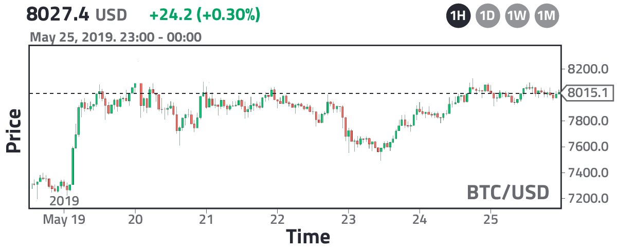 To better understand the concept of Japanese candlesticks, let's consider the fluctuation of bitcoins and let's choose two intervals of time for each candle, one-day and one-hour. The former is given in Fig. 3, where we see that each candle has an interval of 24 hours; therefore, for the month of May 2019, there will be at most 31 candles (one for each day). The latter is given in Fig. 4, where each candle is one hour long, so for each day there will be 24 candles. You can see these differences comparing Figs. 3 and 4, where Fig. 4 corresponds to the region given by the blue box in Fig. 3, that is, it corresponds to the period: May 19th to 25th, 2019. Clearly, Fig. 4 gives us more detailed information about what happened in that period, for example, it is thanks to Fig.4 that we know that the dramatic growth of bitcoins on May 19th happened in the first 4 hours.