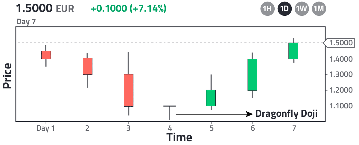 When the low point of a set of candles takes the shape of a dragonfly (opening ≈ closing ≈ maximum), it is called a Dragonfly Doji and is a strong indicator of a trend reversal, that is, if you encounter an asset that is forming a candlestick pattern similar to the one in Fig. 6, you can proceed to buy the asset at time = 6 because the probability is high that it won't fall again; consequently, candlesticks are really helpful, indeed... With experience you will be able to memorize various patterns that identify a change in trend, these are registered on various websites and therefore we skip the list of patterns here. Now let's move on to study the six-color candles.