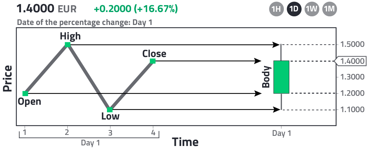 In Fig. 1 we have the up candle and in Fig. 2 the down candle. As you can see, it is colored depending on whether the price of the asset increased or decreased over time. In this case, the green (red) color indicates that the price increased (decreased), that is, the opening price is lower (higher) than the closing price; however, although this is the convention in the West, you should keep in mind that in East Asia the colors are inverted, that is, it is colored red (green) when the opening price is lower (higher) than the closing price. To check this color convention difference, I invite you to read the article: "Differences between the stock exchanges of Japan and the United States." Figs. 1 and 2 are given considering the template used by nepy.pe to plot its charts. In this example, the candles are one day long and we have only drawn the candle for day 1. Each candle has 4 important times. Time 1 is the opening time, time 4 is the closing time, and times 2 and 3 represent intermediate points where the asset took maximum and minimum values. As you can see, the body of the candle is the rectangle defined by the opening and closing prices, while the maximum and minimum values are defined by drawing linear extensions to the body of the candle; therefore, the candle gives us a summary of how the price of an asset has fluctuated in a given interval. In Figs. 1 and 2, the percentage change is calculated as (close-open)/open x 100. In certain cases, one wishes to calculate the percentage change for a group of candles. If so, the opening price of the first candle and the closing price of the last candle are considered. In the given template, the price that appears in the header is the closing price of the last candle of the chart, in this case, as there is only one candle, it corresponds to the closing price of such candle, i.e., 1.4 EUR for the up candle and 1.2 EUR for the down candle.