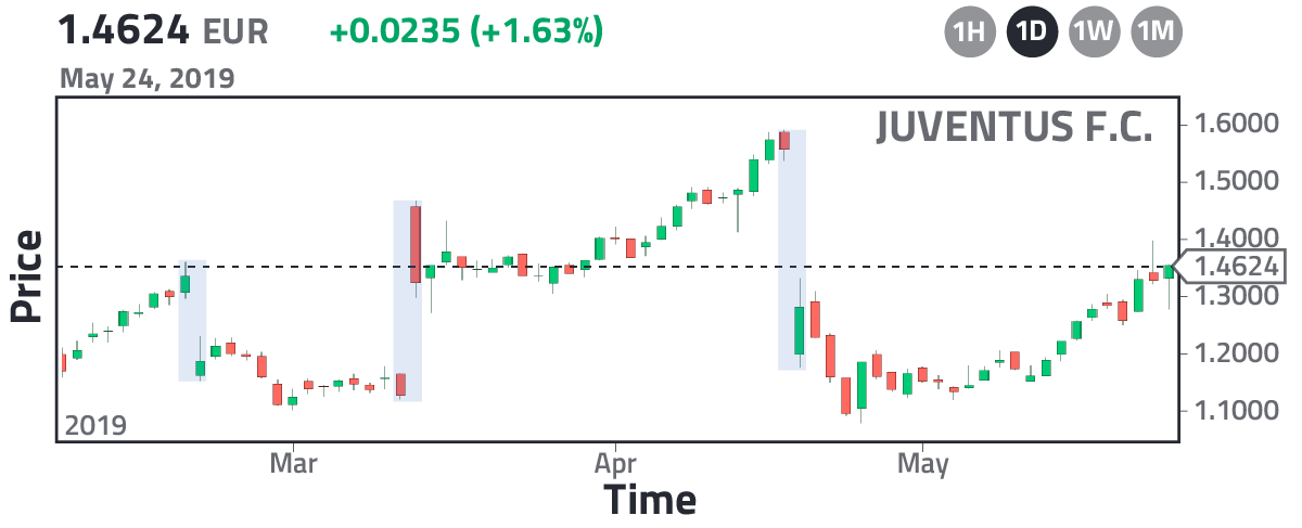 The Milan Stock Exchange opens at 9:00 AM and closes at 5:30 PM, local time. That is, the one-day candle is not equal to 24 hours but, in this particular case, to 8 and a half hours. Each stock exchange is different so keep in mind that they may have different opening times. Although there is an opening time, there is the option to buy or sell shares before the market opens, and it is precisely in this pre-interval of time, called the pre-market, that the price of the share can fluctuate strongly; however, is not reflected in the candlestick pattern because the candle only shows the official time, so as you can see in Fig. 5 with Juventus shares, there are 3 dates in which Juventus had a strong fluctuation before the market opened, giving rise to a discontinuity in the candlestick pattern (blue boxes in Fig. 5). In the cryptocurrency market we will never encounter a discontinuity because there is no "pre-market" as such, keep in mind that the cryptocurrency market operates 24 hours a day. You may be wondering: Why did Juventus have a sharp fluctuation on those dates? The answer is out of the scope of this article, but if you are interested, you can find it at: "Football: bookmaker versus the stock market."