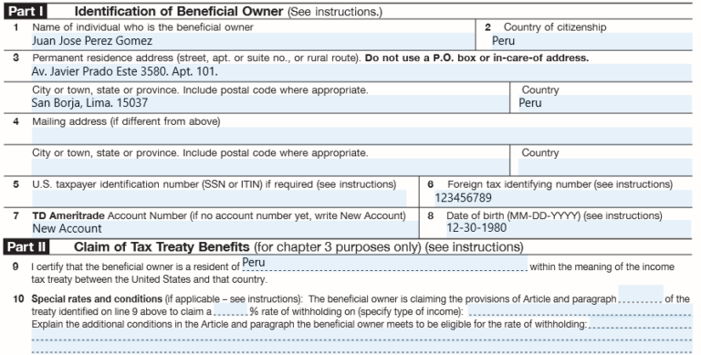 As you can see in Fig. 1, there are blank spaces that you don't have to worry about filling. For more information, contact TD Ameritrade. The most important point in Fig. 1 is the Foreign Tax Identifying Number (FTIN). You should contact the government entity in your country that is in charge of the capital gain taxes to get this number. For example, in Peru this institution is known as SUNAT, and the FTIN number is known as RUC. Nowadays, of course, it is likely that you can request this number online. For example, in Peru, you just type "RUC Peru" in Google and the first page takes you to the website of SUNAT.