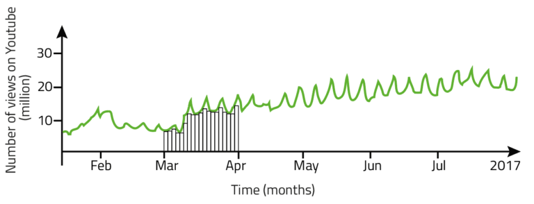 Fig. 2: Despacito’s number of views on Youtube vs time (real data).