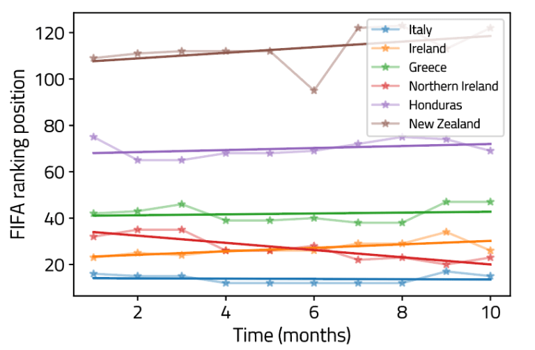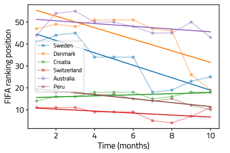 We then plot the data given in Table V. We fit these data to a line using the least squares method. A more advanced study of this method is given in the tutorial: "The least squares method with Despacito." This linear fit is what we call a linear trend because we are approximating a given data to a line in order to easily deduce if over time a team improved in the FIFA ranking or not. The lines with a negative slope indicate an improvement in the ranking. These calculations were developed in Python, you can download the code from my repository @Github.