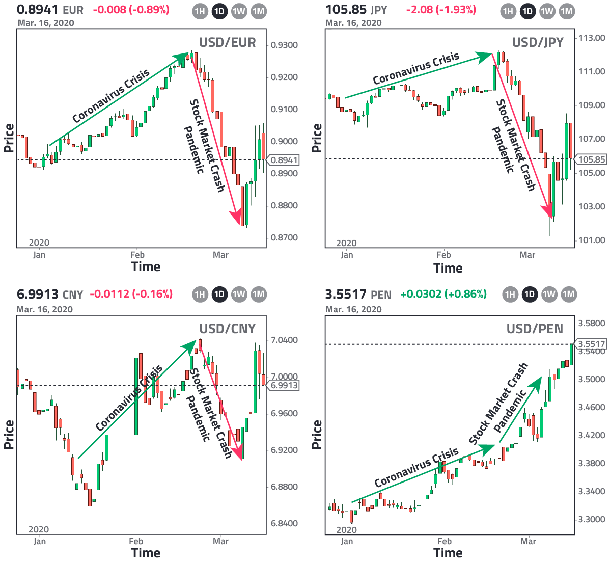 We explain how the world currencies fluctuate during a financial crisis. As an example we consider the event that arose in the year 2020: The coronavirus. The conclusions given here will allow us to face future crises and make profits exchanging currencies.