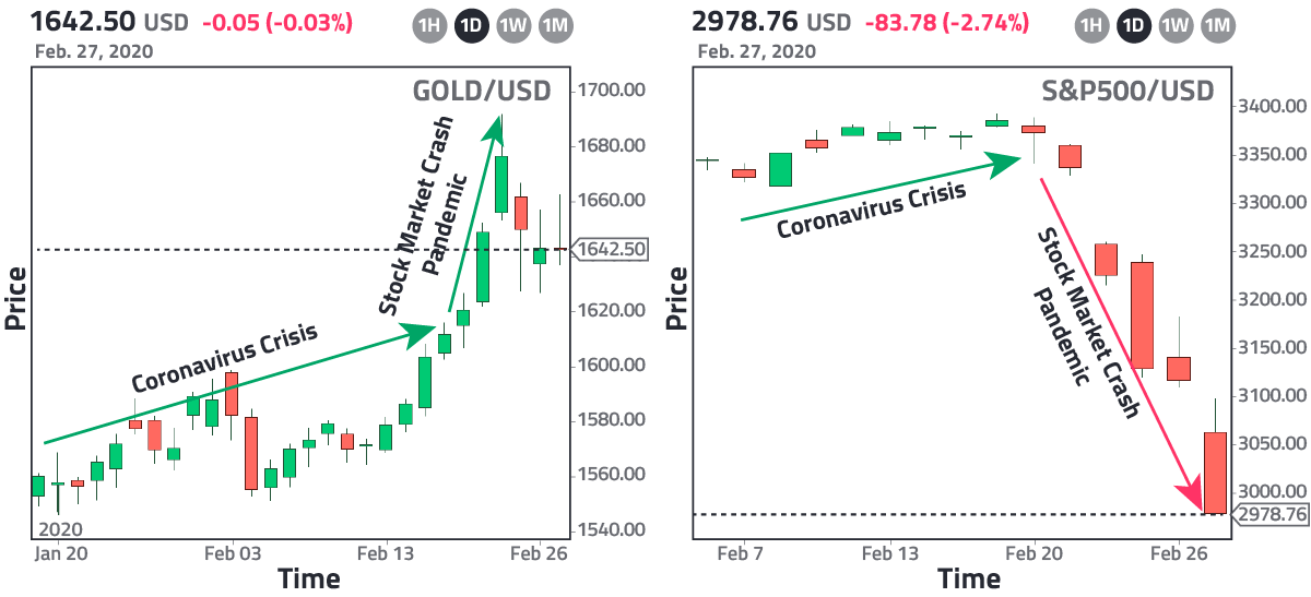 In Fig. 2, the green arrow represents the first months of the viral crisis. If you would have been aware of the Chinese problem in December, you would not have sold your dollars because you would have thought that the Asian crisis would trigger a strong demand for them. Nonetheless, what happened at the end of February? On February 20th, 2020 to be exact, the World Health Organization (WHO) declared that COVID-19 was already a pandemic and with it, the dollar collapsed against the strongest currencies in the world (see Fig. 2). Why? Because the investor, who had chosen to buy and hold the dollars, changed his/her mind and sold them due to the fact that in a pandemic not only the Asian and European continents are in trouble but also the American territory. Where then does the investor deposit his or her money? In periods of global crisis the holy grail is gold, that is, investors sell their dollars to buy gold bars. Precisely, you can clearly see this in Fig. 3 where we show the price chart of gold and the S&P 500 index for the month of February. This index takes the average of the 500 largest companies listed on the United States Stock Market. As you can see, on February 20th, this index began to plummet, and on that same week, gold experienced massive growth.