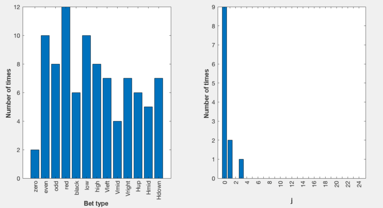 In Fig. 2 (left) we show a histogram of how many times each type of number has come out, more details appear in rouletteMartingale.m. As you can see, what we said in the previous section is true, that in a million games all numbers must come out in the same proportion, that is, we have practically the same amount of reds and blacks, of evens and odds, of highs and lows, etc. In Fig. 2 (right) we are showing the Martingale bet. As you can see, in a million games it is feasible to obtain, at least once, j = 19, that is, it is feasible that the color red does not appear in 19 consecutive games, something that seems illogical, but statistically speaking it is a real phenomenon. Keep in mind that this result is for a million games that I played, possibly if you run the program, you may get a higher j, because certainly the probability of getting j beyond 19 will never be zero. In general we have: