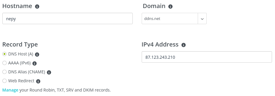With this information, we create the DNS. In our case, it is nepy.ddns.net, and it is linked to the IP 87.123.243.210, which corresponds to the hp device.