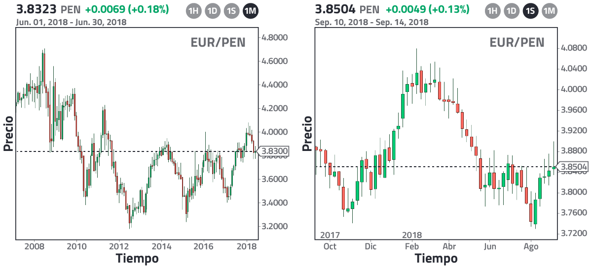 En la Fig. 1 vemos la evolución EUR/PEN desde el año 2008 hasta el año 2018 (izquierda) y desde octubre 2017 hasta agosto 2018 (derecha). En el primero consideramos velas japonesas de un mes y en el segundo de una semana. Para entender el concepto de velas japonesas te invito a leer el siguiente artículo: "Las velas japonesas. Explicación completa para principiantes". Enfoquémonos primero en la imagen de la izquierda. El valor máximo del euro ha sido 4.7057 soles y ocurrió en el año 2008. Para esa fecha, tener 1 euro en tu bolsillo equivalía a tener 4.7057 soles. Este valor podría ser la cota superior del euro; no obstante, es mejor definir esta cota como el promedio de todos los máximos locales a lo largo de los últimos 10 años, el cual da un valor aproximado de 3.9 soles; por ende, este valor será la cota superior. Similarmente, la cota inferior viene dada por el promedio de todos los mínimos locales, de esa forma obtenemos un valor aproximado de 3.5 soles. ¿Qué significa esto? Que en promedio, el euro ha oscilado entre 3.5 y 3.9, ¿pero cómo esto nos puede generar ganancias? Para entenderlo, ahora enfoquémonos en la imagen de la derecha y asumamos que estamos en enero 2018. Como puedes apreciar, para tal fecha el euro ha cruzado la barrera de 3.9 soles, es decir, ha superado la cota superior; por tanto, es factible asumir que no crecerá más allá de ese valor, o en otras palabras, en breve se devaluará. ¿Qué hacemos? ¡Vendemos euros! Digamos que tenemos 1000 euros en el bolsillo, los vendemos y recibimos 3900 soles a cambio. Lo que viene después es esperar a que la tasa de cambio se aproxime a la cota inferior. Llega agosto 2018 y como podemos apreciar, el euro se ha devaluado hasta 3.74. Nuestra cota inferior está en 3.5, por tanto, podemos esperar o simplemente compramos euros en agosto para obtener ganancias inmediatas. Como el euro con los días empieza a recuperarse hasta 3.8, optamos por lo segundo. Compramos 1000 euros y por ello pagamos 3800 soles, 100 soles menos de lo que recibimos en enero. A fines de agosto en nuestros bolsillos tendremos los 1000 euros iniciales más 100 soles en ganancias que aparecieron como por arte de magia.