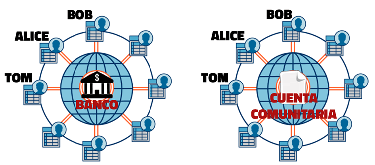 Fig. 3: Sistema centralizado donde el banco es el único que tiene acceso a los datos (izquierda). Sistema descentralizado donde todos tienen acceso a la cuenta comunitaria (derecha).