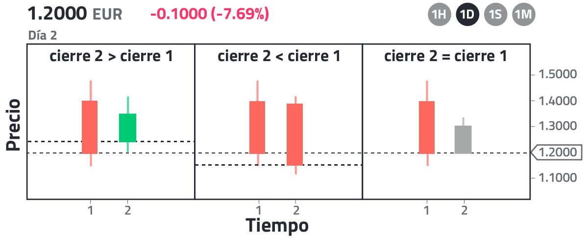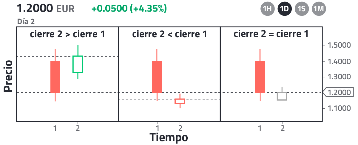 En las Figs. 10 y 11, consideramos gráficas con 2 intervalos tiempo, t = 1 y t = 2. Si t equivale a 1 minuto, entonces t = 1 es el primer minuto y t = 2 es el segundo minuto. Para simplificar el análisis, en todos los casos elegimos la primera vela (en t = 1) como una vela roja sólida. Independiente de esta vela, la segunda vela (en t = 2) puede ser hueca o sólida. En la Fig. 10 mostramos las velas huecas y en la Fig. 11 las sólidas. Ya hemos dicho que las huecas representan el crecimiento del activo y las sólidas su caída. El color en la segunda vela (en t = 2) nos permite diferenciarla respecto a la primera (en t = 1). Se pinta de color verde cuando el precio de cierre en t = 2 es mayor al precio de cierre en t = 1 (cierre 2 > cierre 1). Se pinta de color rojo cuando el precio de cierre en t = 2 es menor al precio de cierre en t = 1 (cierre 2 < cierre 1). Y finalmente, se pinta de color gris cuando el precio de cierre en t = 2 es igual al precio de cierre en t = 1 (cierre 2 = cierre 1). Consecuentemente, en contraste a las velas de dos colores, las velas de seis colores nos brindan mayor información, e.g., una vela verde hueca representa un crecimiento total, porque crece en su intervalo y además lo hace con respecto a la vela anterior, mientras que una vela roja sólida representa una caída total, porque decrece en su intervalo y también con respecto a la vela anterior.