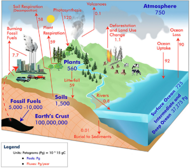 Sin embargo, el ciclo del carbono es más amplio que el descrito anteriormente. También incluye una enorme cantidad de carbono en las rocas, como el carbón, que tiene un 60-80% de carbono. Del mismo modo, muchas otras rocas también contienen un cierto porcentaje de carbono, lo que indica que la cantidad de carbono almacenada en estas rocas es enorme. Las estimaciones indican que la cantidad de carbono almacenada en estas rocas es unas dos mil veces o más que las cantidades presentes en la atmósfera. La Fig. 2.2.1 muestra el ciclo del carbono.