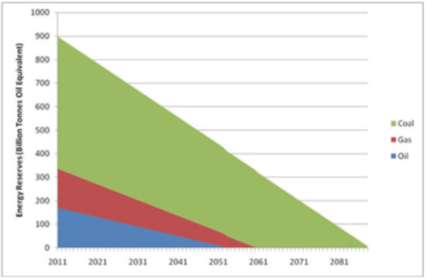 Como se muestra en la Fig. 2.3.1, se puede apreciar que las reservas de combustibles fósiles ya no existirán. Para 2052, 2060 y 2090, las reservas de petróleo, gas y carbón se habrán agotado, respectivamente. Sin embargo, según el informe anual del gigante petrolero British Petroleum BP, la Tierra tiene cerca de 1.688 billones de barriles de crudo, que durarán 53,3 años a las tasas de extracción actuales (Christian Science Monitor, 2014).