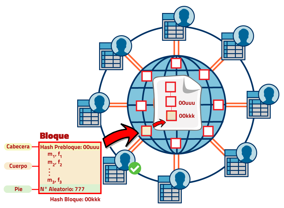 Como puedes ver, en realidad todos tienen su propia copia de la cuenta comunitaria, ya dijimos que un programa Peer to Peer permite transferencias de PC a PC, por tanto, en el universo de los bitcoins, se transfieren estas cuentas comunitarias, o mejor dicho, se transfieren los bloques de dichas cuentas, y la elección de cual aceptar en tu PC estará sujeta a cual consideras que tiene mayor validez. Por ejemplo, si Bob altera su cuenta comunitaria, cambiará el hash de sus bloques, y si tú observas que hay otras 1000 personas que tienen un hash distinto al de Bob y son iguales, entonces necesariamente estarás convencido que la cuenta comunitaria de Bob es incorrecta y no le prestarás atención. Bob, solo depende de que alguien acepte copiar su cuenta, lamentablemente nunca tendrá éxito a menos que más del 50% de jugadores sean sus amigos, algo que será imposible de alcanzar por la cantidad de jugadores en línea que hay. Por esta razón, el historial de transacciones está protegido gracias al concepto de la blockchain.