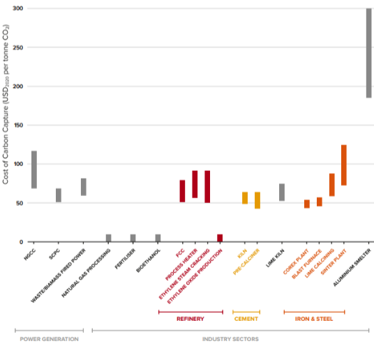 Fig. 4.2.2. Costo de la captura de carbono en varios tipos de procesos industriales y de energía, excluyendo la compresión de CO2 (Global CCS Institute, 2021).