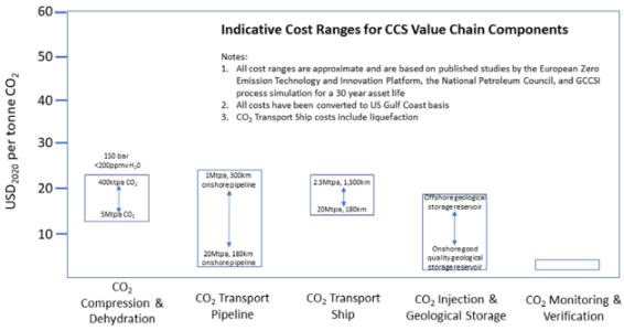 Fig. 4.2.3. Rangos de costos indicativos para los componentes de la cadena de valor de CCS (excluyendo la captura) – Costa del Golfo de EE. UU. (Global CCS Institute, 2021).