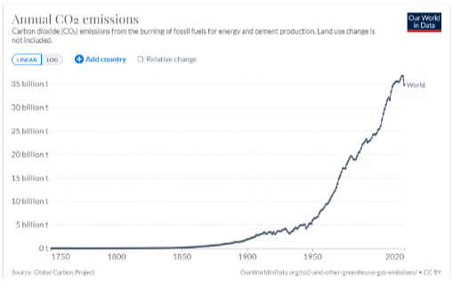 Como se explicó anteriormente, el CO2 es la principal causa del calentamiento global y el cambio climático. Cuanto más CO2 hay en la atmósfera; más dañino será el efecto. Desde que ocurrió la Revolución Industrial en el siglo XVIII, el CO2 ha crecido a pasos agigantados. La Fig. 4.1.1 muestra el crecimiento de las emisiones globales desde mediados del siglo XVIII hasta la actualidad.
