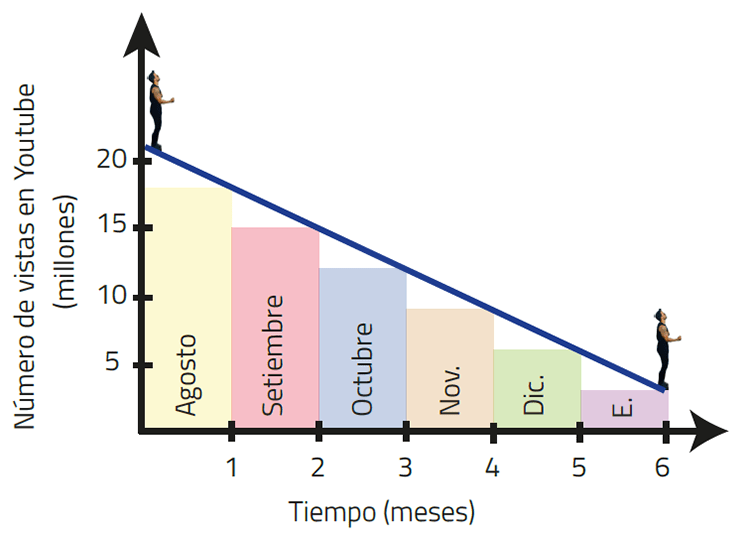 Desde que apareció en el mes de enero del año 2017, Despacito empezó a crecer a 6 millones de vistas por día, pasando luego a 16 millones en el mes mayo y llegando a 21 millones en el mes de julio. ¿Qué ocurrirá en los próximos meses? Pronosticamos que para enero 2018, Despacito decaerá a 3 millones de vistas por día porque ese ha sido el valor estable de muchas canciones icónicas. Aquí algunos ejemplos: