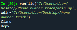 #Introducing the phone number to be tracked number = '+51 XXXXXXXXX' phone_number = phonenumbers.parse(number) carrier = carrier.name_for_number(phone_number, 'es') region = geocoder.description_for_number(phone_number,'es')