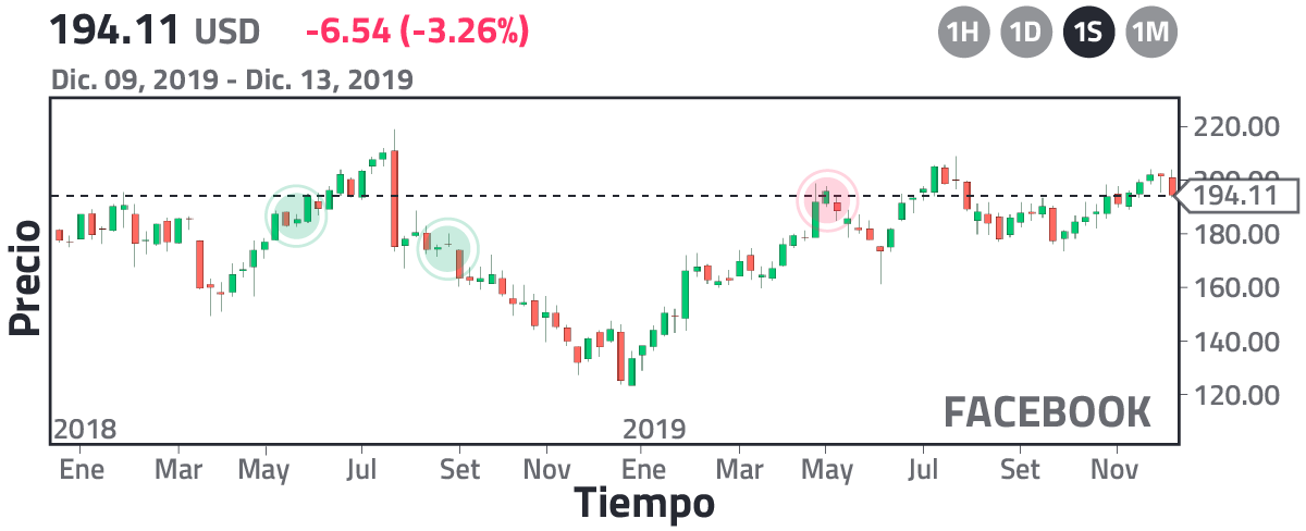 Los círculos verdes en las Figs. 1 y 2 representan las fechas en las que compré acciones y los círculos rojos las fechas en que las vendí. Estas gráficas están dadas considerando velas japonesas de una semana, es decir, cada vela equivale a una semana de tiempo. Para mayores detalles sobre velas japonesas, te invito a leer el artículo: "Las velas japonesas. Explicación completa para principiantes".