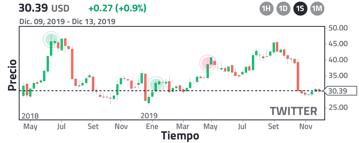 Posiblemente estés pensando que es imposible saber el momento correcto para comprar. Te equivocas, la verdad es que existen mecanismos que permiten determinarlo, eso lo discutiremos en otra oportunidad, pero por ejemplo, si observas nuevamente la Fig. 2 y yo te hago la siguiente pregunta: "¿Te animarías a comprar acciones de Twitter en diciembre 2019?". ¿Qué responderías? En mi caso yo respondería: "Por supuesto, si un año atrás compré acciones a 45 USD, comprarlas a 30 USD es bien barato para mi. Además, en promedio, 30 USD es el valor más bajo que Twitter ha experimentado en los últimos años". Si tu respuesta es similar a la mía, entonces ya tienes una ligera idea de que sí es posible saber cuando es el momento correcto para comprar... y para que lo puedas verificar te invito a ver las gráficas del futuro, las del año 2020, 21, 22 y en adelante, es probable que te sorprendas al saber que no estaba equivocado.