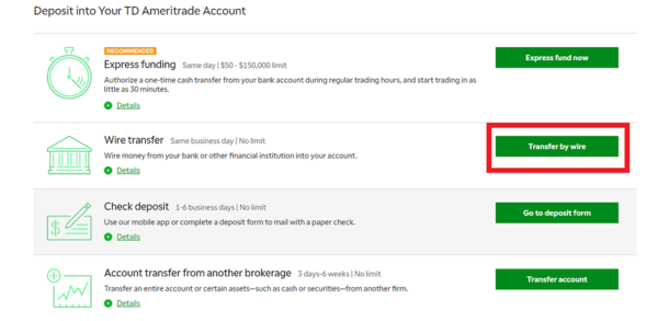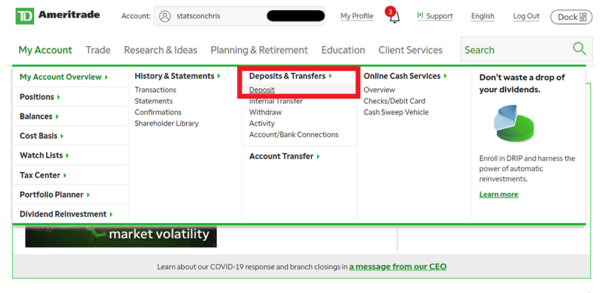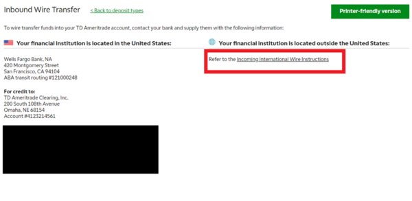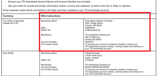 Transferir dinero a tu cuenta personal. Finalmente, si quieres invertir en la bolsa de valores tienes que depositar dinero en tu cuenta personal. Si no vives en EEUU ni posees una cuenta bancaria en dicho país, entonces la única opción que te queda es una transferencia internacional, es decir, tu banco local girará el monto a la cuenta de TD Ameritrade y por ello te cargará una cierta comisión. Esta comisión puede variar de 30 a 70 USD, dependiendo de tu país, del banco que utilices y del monto que deseas enviar. En Perú, por ejemplo, los bancos suelen cobrar 30 USD por montos que alcanzan los 3000 USD y 40 USD por montos que van desde los 3000 a los 10 000 USD. En este sentido, si vives en Perú y piensas transferir 300 USD, pues no te conviene porque el banco te descontaría 30 USD, es decir, perderías el 10% de tu capital solamente en transferencia. Eso es mucho dinero, por tanto, sería recomendable, en el peor de los casos, transferir 3000 USD, solo así estarías perdiendo únicamente el 1% de tu capital. A continuación te muestro los pasos que debes seguir desde tu cuenta personal para acceder a los datos de la cuenta bancaria de TD Ameritrade, estos datos se los darás a tu banco para que ellos se encarguen de hacer la transferencia: