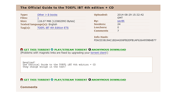 Por ejemplo, si deseas ubicar información sobre el TOEFL iBT, accede a thepirate-bay.org y sigue los pasos dados en la siguiente imagen:
