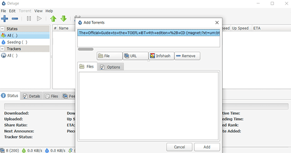 Instalarlo solo tomará un par de clicks, deluge-torrent.org es un cliente de BitTorrents, o en palabras sencillas, es el software que te permitirá descargar archivos desde la computadora de otro usuario en la red.
