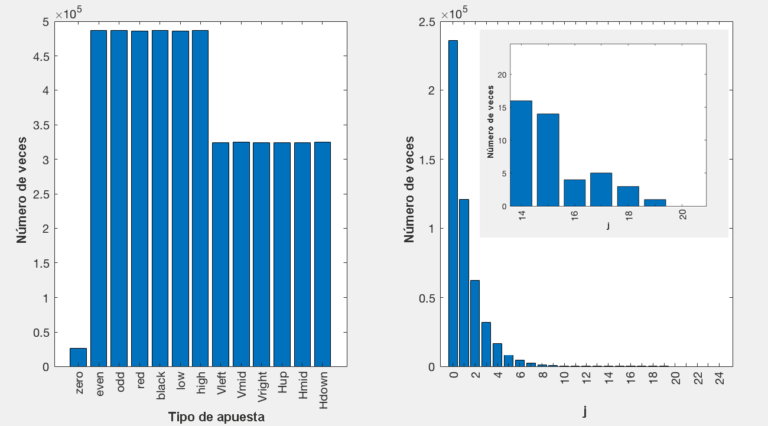En la Fig. 2(izq.) estamos graficando cuántas veces han salido cada tipo de apuesta, mayores detalles aparecen en el archivo rouletteMartingale.m. Como puedes observar, se cumple lo dicho en la sección anterior, que en un millón de juegos todos los números deben salir en la misma proporción, es decir, saldrán prácticamente la misma cantidad de rojos y negros (red & black), pares e impares (even & odd), altos y bajos (low & high), etc. En la Fig. 2(der.) estamos graficando la apuesta de Martingale. Como puedes apreciar, en un millón de juegos es factible obtener, al menos una vez, j=19, es decir, puede darse el caso que el color rojo no salga en 19 juegos consecutivos, algo que parece ilógico de creer, pero que estadísticamente es un fenómeno real. Ten presente que este resultado es para un millón de juegos que yo ejecuté, posiblemente si tú ejecutas el programa, obtengas un j aún mayor, porque ciertamente la probabilidad de obtener j más allá de 19 nunca será cero. En términos generales tenemos: