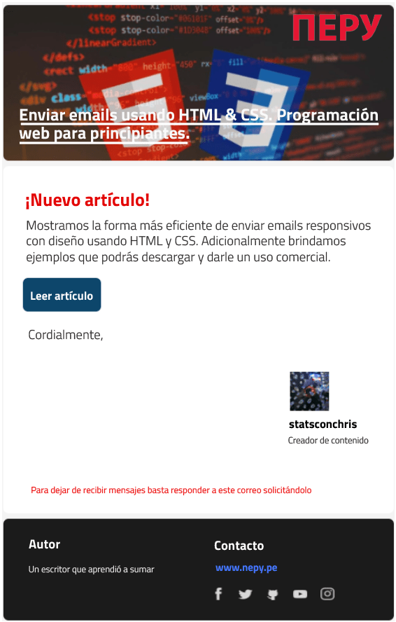 Si estás suscrito a este sitio web, entonces la Fig. 1 te es familiar, porque suelo enviar mensajes con ese diseño y quizás cuando lo has recibido te has preguntado, ¿cómo uno lo podría hacer? Esto se logra haciendo uso de HTML & CSS, específicamente creando tablas transparentes con diseños responsivos. No te preocupes si no entendiste lo que acabo de decir porque aquí lograrás capturar la esencia haciendo uso de las siguientes herramientas: i) una cuenta de Gmail, ii) una cuenta de ImgBB, iii) el navegador Google Chrome y iv) el plugin de edición de cloudHQ. Estas herramientas no son fundamentales, pero las usaremos para aligerar la explicación. Si eres nuevo en esto, te recomiendo ver el siguiente video donde explico paso a paso cómo usar las herramientas y cómo modificar el código HTML.