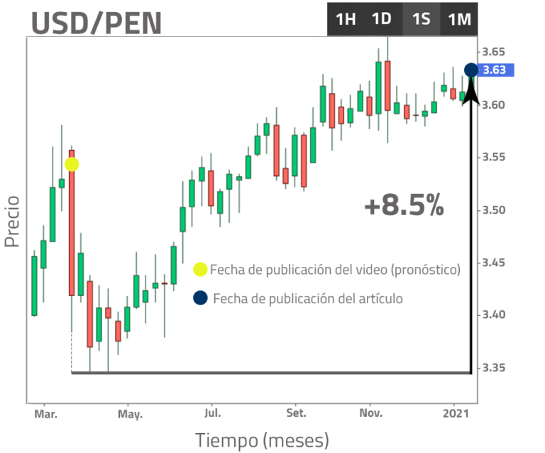 En la Fig. 1, el punto amarillo indica la fecha en que se hizo la predicción (23 de marzo del 2020). En el minuto 17:04 del video previamente mencionado, afirmé que la tasa de cambio USD/PEN necesariamente tenía que caer y que uno debía animarse a recomprar dólares al valor de 3.35 soles peruanos (línea horizontal negra en la Fig. 2). En caso tu moneda local hubiese sido otra, bastaba estar al tanto de la fluctuación USD/PEN y para la fecha en que el dólar tocó 3.35 PEN, era también el momento idóneo para comprar dólares con tu moneda local. En caso hubieses aplicado esta predicción, para enero 2021 estarías con un +8.5% en ganancias, lo cual es superior a los beneficios de los bancos, pero ¿cómo pude saber el valor exacto al cual comprar? La respuesta viene dada por un análisis ténico de soporte y resistencia que aparece explicado en el video: "Las velas japonesas".