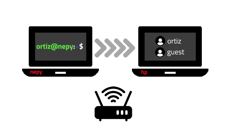Ahora ya estás listo para conectarte desde otro dispositivo en la misma red usando SSH. En este ejemplo, el segundo dispositivo es nepy, ver Fig. 1. Este dispositivo tiene un usuario: ortiz@nepy. Recuerda que el dispositivo hp tiene dos usuarios: i) ortiz@hp y ii) guest@hp. Escribe lo siguiente en el terminal del dispositivo nepy: